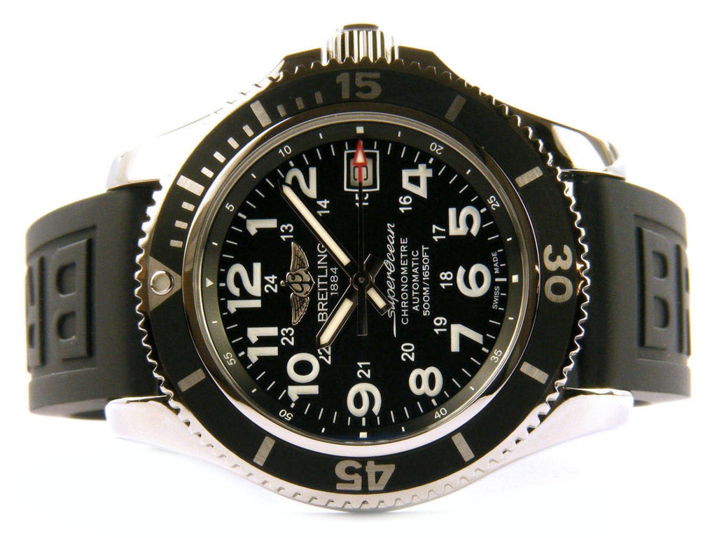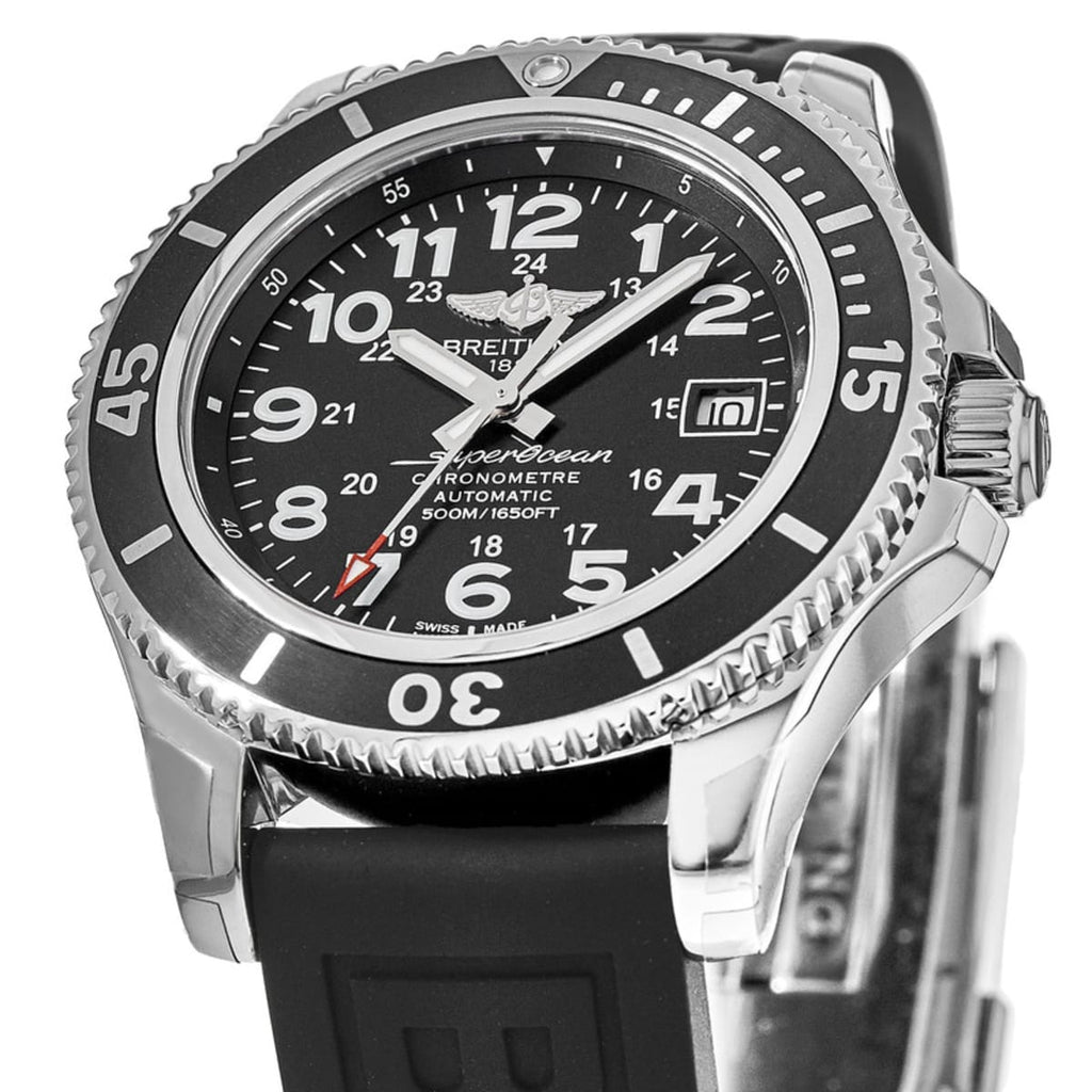 Breitling Superocean II 42 mm watch. Model reference: A17365C9.BD67.150S.A18S.1. Stainless steel case. Black dial. Automatic movement. Black rubber strap and steel pin buckle. Swiss made. Watch comes in original packaging, with set of documents and 2 years warranty.