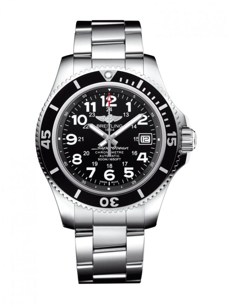 Luxury watches Breitling Superocean II 42 Water resistance 500M, Automatic, 42 mm. The watch has functions luminescence and date . Basic parameters of the watch are: dial colour is black, movement type is mechanical watch with automatic winding, strap material is steel and water resistent is 500 m.