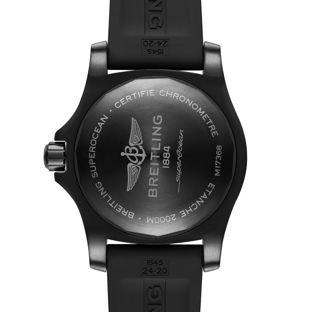 Power, functionality and cool, contemporary style define Breitling’s Superocean Automatic collection: tool watches for the active, modern diver. Built to last, the Superocean Automatic 46 features a sturdy 46-mm black steel (DLC-coated stainless steel) case, black dial and a matching Diver Pro III rubber strap with pin buckle or folding clasp. Complete with ratcheted unidirectional bezel, and water-resistant up to an impressive 200 bar (2000 meters), it is the ultimate in robustness and reliability for deep-sea adventurers.Sporty, colorful and bold, the Superocean Automatic 46 is designed for daring men looking for a sports watch combining exceptional performance with contemporary style. It is up to any challenge: dive with it, surf with it or swim with it!
