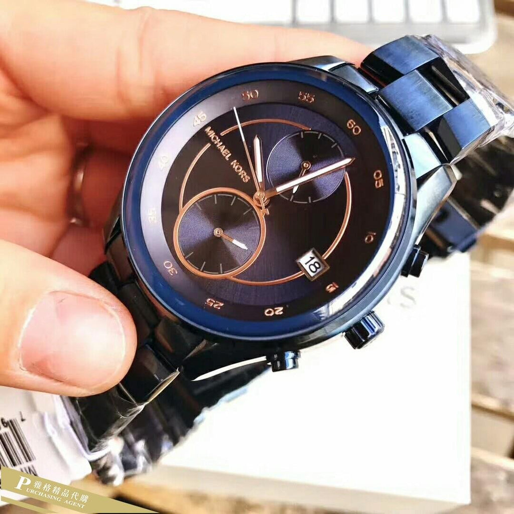Navy blue ion plated stainless steel case with a navy blue ion plated stainless steel bracelet. Fixed navy blue stainless steel bezel. Navy blue dial with rose gold-tone hands and index hour markers. Minute markers around the outer rim. Dial Type: Analog. Date display at the 3 o'clock position. Quartz movement. Scratch resistant mineral crystal. Solid case back. Case size: 40 mm. Case thickness: 11 mm. Round case shape. Band width: 20 mm. Water resistant at 50 meters / 165 feet. Functions: date, hour, minute, second. Dress watch style. Michael Kors Briar Navy Blue Dial Ladies Multifunction Watch MK6468.- Case Thickness: 11 mm; Case Diameter: 40 mm; Band Width: 20 mm; Strap Circumference: 190 +/- 5 mm