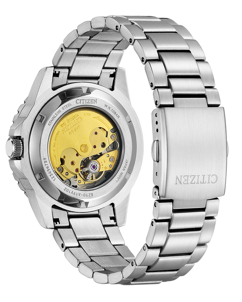 Citizen Caliber 8210 Automatic movement, containing 21 Jewels, bitting at 21600 vph, and has a power reserve of approximately 45 hours.