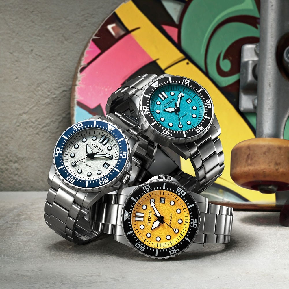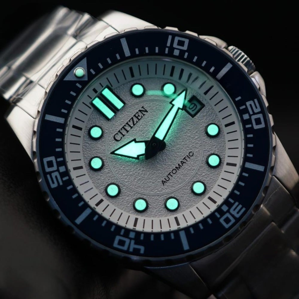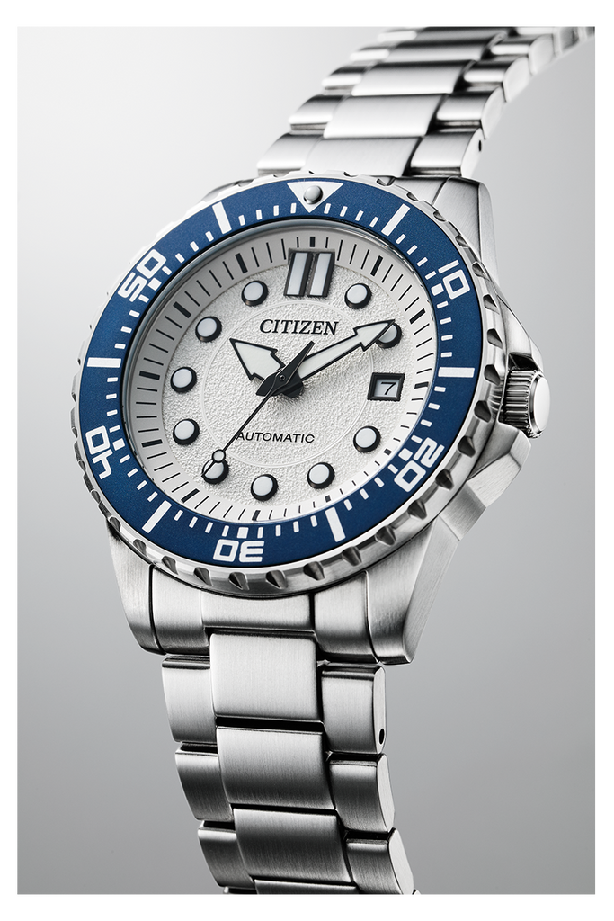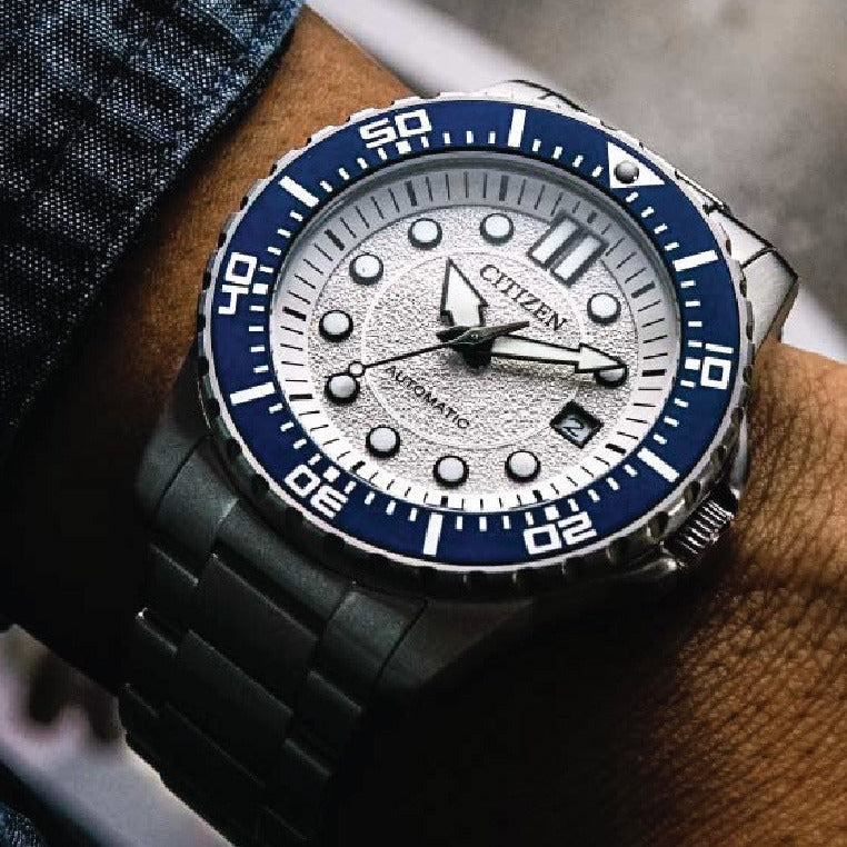 Citizen NJ0171-81A Metal Band Men Watch. The case is made out of silver stainless steel with a blue bezel, which stands for the high quality of the item, it has a white color dial. This model has got 100 meters of water resistance. it can be worn in scenarios where it is likely to be splashed but not immersed in water and will be fine in rain. The watch is shipped with an original box and a guarantee from the manufacturer.