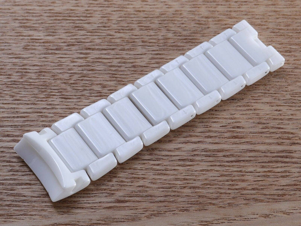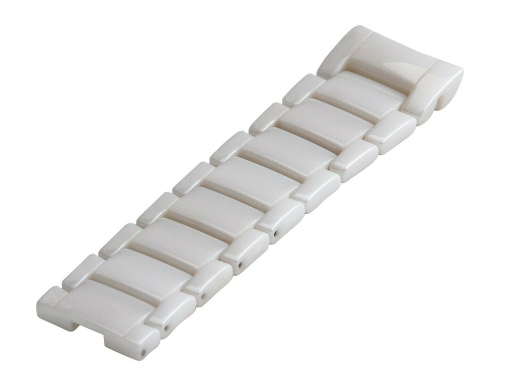 White ceramic case with a white ceramic bracelet. Fixed white ceramic bezel. White matte dial with silver-tone hands and index hour markers. Dial Type: Analog. Date display between 4 and 5 o'clock position. Chronograph - three sub-dials displaying: 60 second, 60 minute and 24 hour. Quartz movement. Scratch resistant mineral crystal. Solid case back. Round case shape, case size: 43 mm, case thickness: 12.6 mm. Band width: 22 mm. Water resistant at 50 meters / 165 feet. Functions: chronograph, date, hour, minute, second. Dress watch style. Emporio Armani Ceramica Chronograph White Dial Men's Watch AR1453.