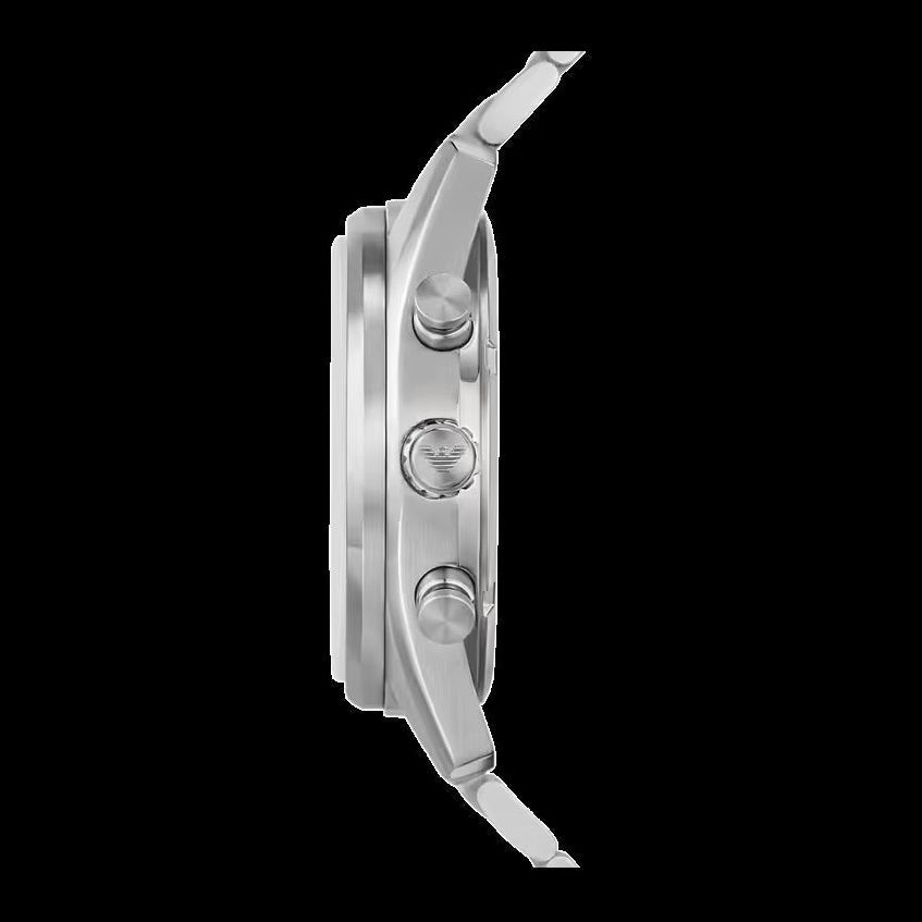 Emporio Armani's 42mm watch features a silver sunray dial with black cd finished subeyes, chronograph movement and stainless steel bracelet.