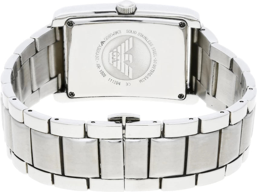 Quartz movement. Scratch resistant mineral crystal. Solid case back. Case diameter: 32 mm. Case thickness: 10 mm. Rectangle case shape. Band width: 22 mm. Deployment clasp. Water resistant at 50 meters / 165 feet. Functions: hour, minute, second. Casual watch style. Emporio Armani Classic Black Dial Stainless Steel Men's Watch AR1608.
