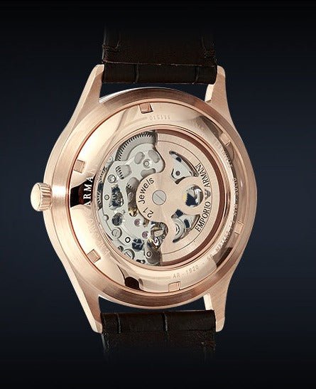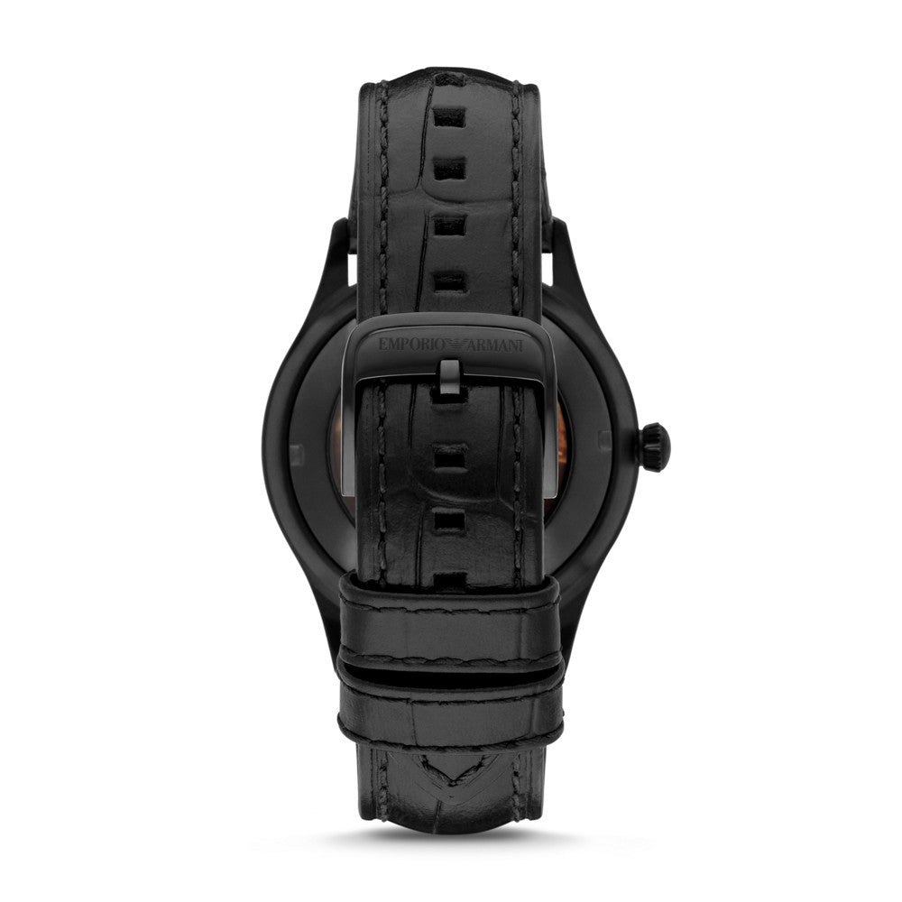 A clear window into the mechanical gears gives an art deco-inspired touch to this emporio Armani dress watch. The matte black leather strap adds bold sophistication.