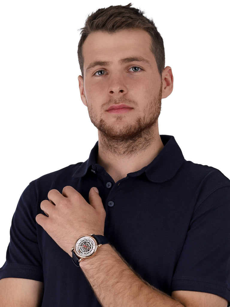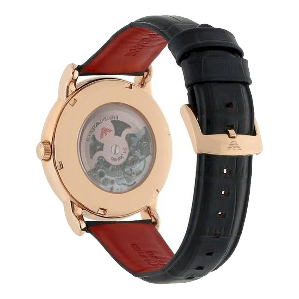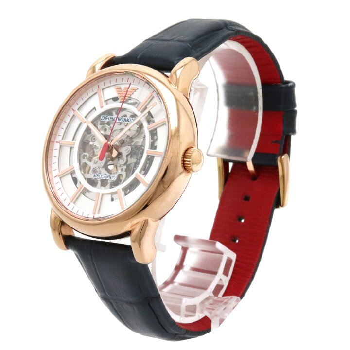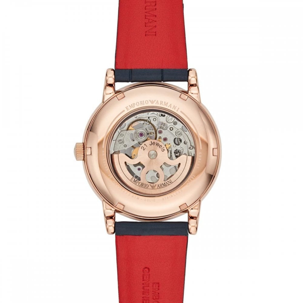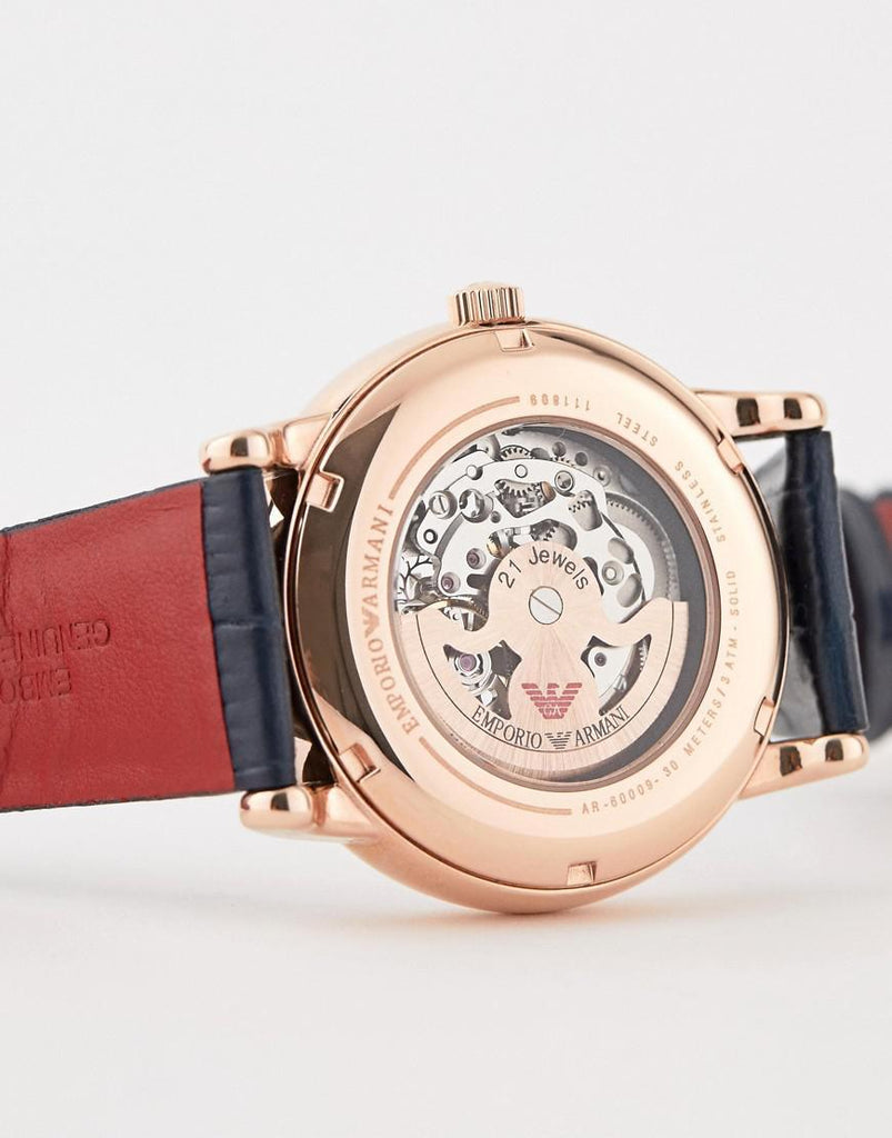 Rose gold-tone stainless steel case with a blue leather strap. Fixed rose gold-tone bezel. White (skeleton centered) dial with luminous rose gold-tone hands and index hour markers. Minute markers around the outer rim. The Emporio Armani eagle appears at the 12 o'clock position. Dial Type: Analog. Luminescent hands. Automatic movement. Scratch resistant mineral crystal. Pull / push crown. Transparent case back. Round case shape. Case size: 43 mm. Case thickness: 13 mm. Band width: 22 mm. Tang clasp. Water resistant at 30 meters / 100 feet. Functions: hour, minute, second. Casual watch style. Emporio Armani Skeleton Automatic White Dial Watch AR60009.- Dial Color: Silver, Case Shape: Round, Dial Glass Material: Mineral
