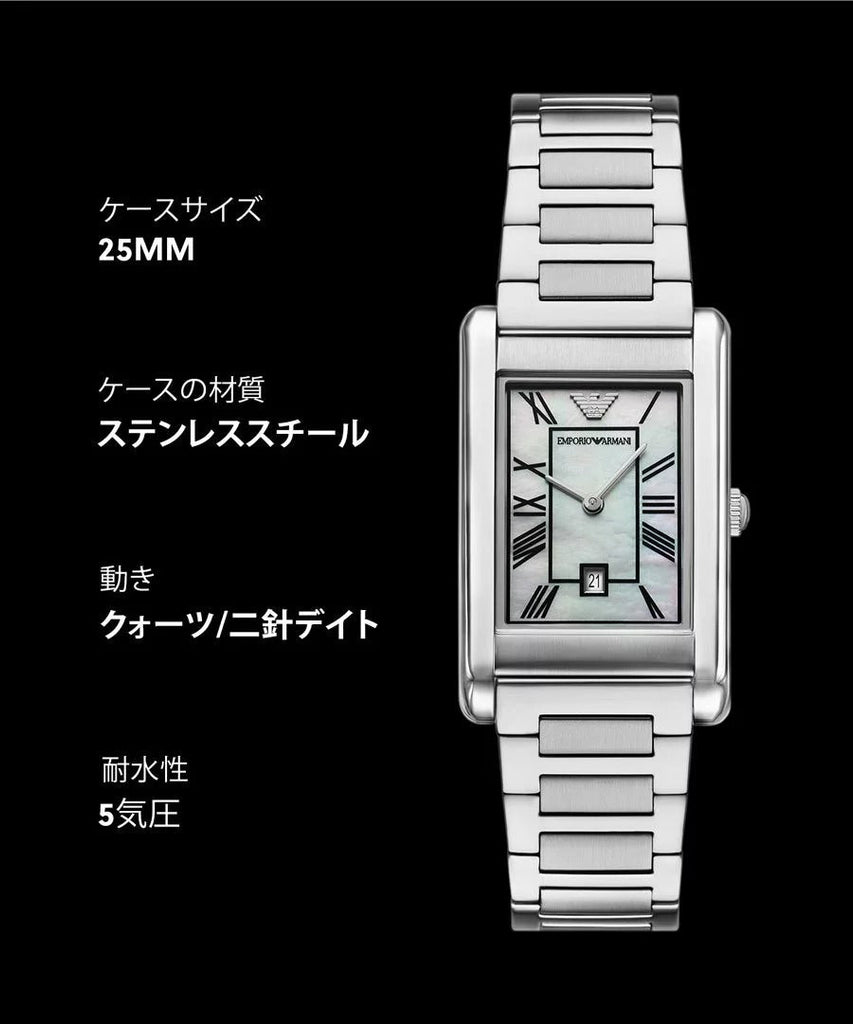• Emporio Armani's 25 x 38mm stainless steel watch is distinguished from the crowd. Featuring a sleek rectangular case and a two-hand date quartz movement, this timepiece stands out with its glossy mother-of-pearl dial adorned with black Roman numeral indexes. The stainless steel H-link bracelet adds a touch of refinement, making it perfect for any dress occasion.