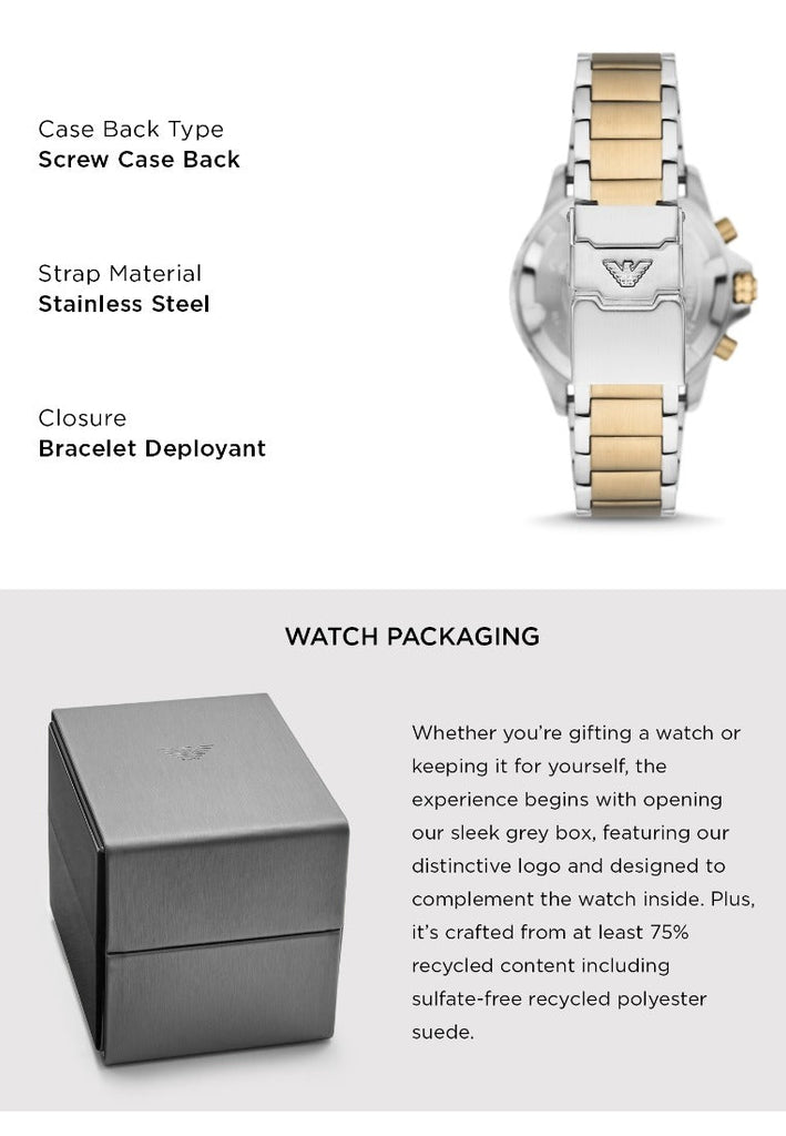 Discover timeless sophistication with the Emporio Armani World Explorer Chronograph. This striking timepiece features a cream dial that exudes elegance, paired with a two-tone steel strap that seamlessly transitions between casual and formal settings. The chronograph functionality adds practical versatility for the modern man who demands both style and substance. Crafted with Emporio Armani's signature precision, this watch elevates any wardrobe while keeping you punctual in refined fashion. An investment in enduring quality and Italian design excellence.
