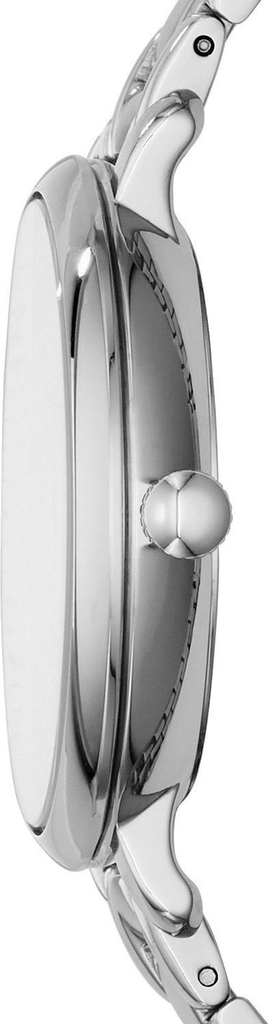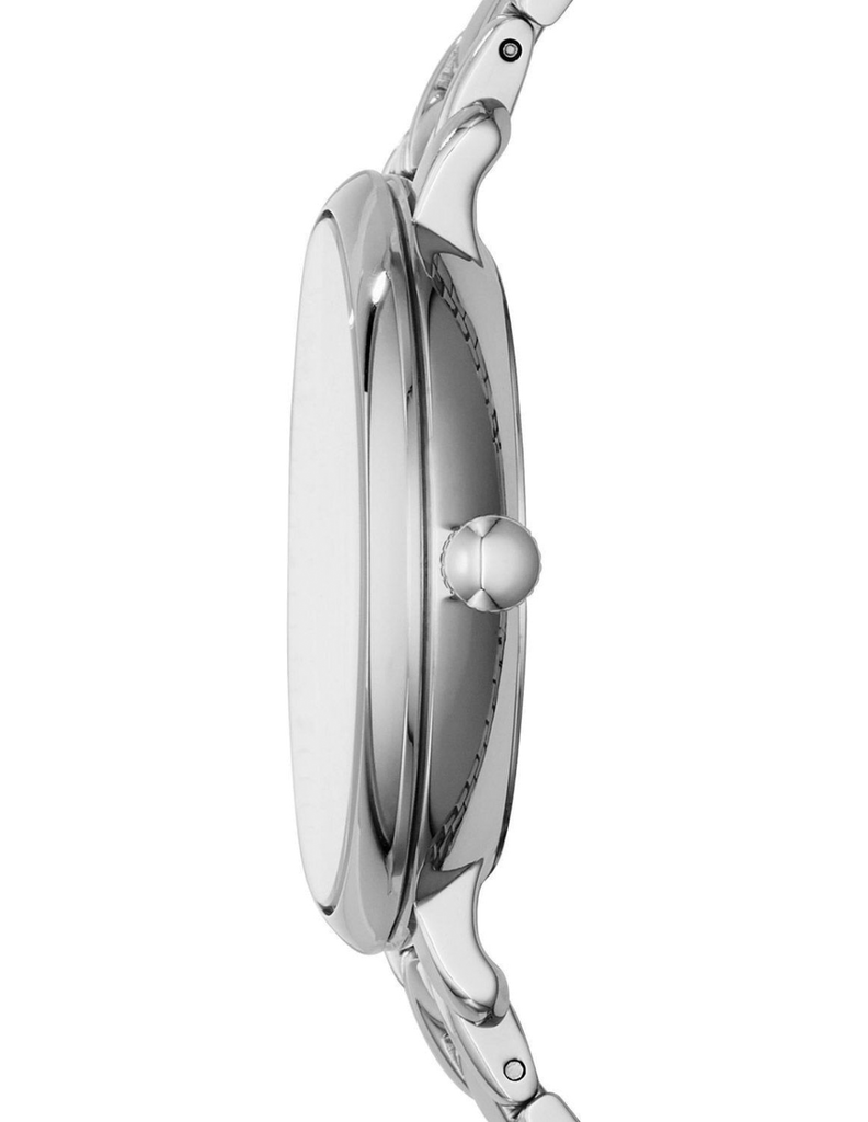 This is a Polished silver-tone watch featuring round dial with brushed outer dial, copper-tone indices, and three subdials for day, date, and 30-seconds along with a 36mm stainless steel case with mineral dial window