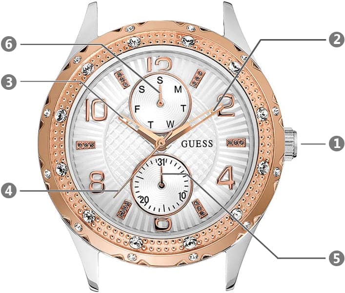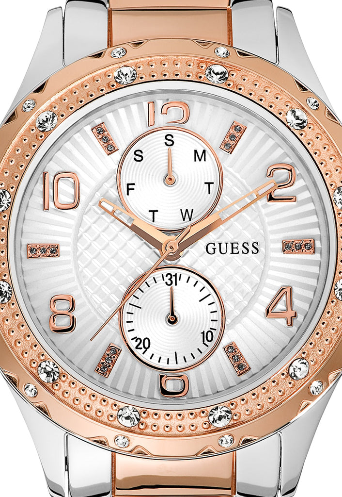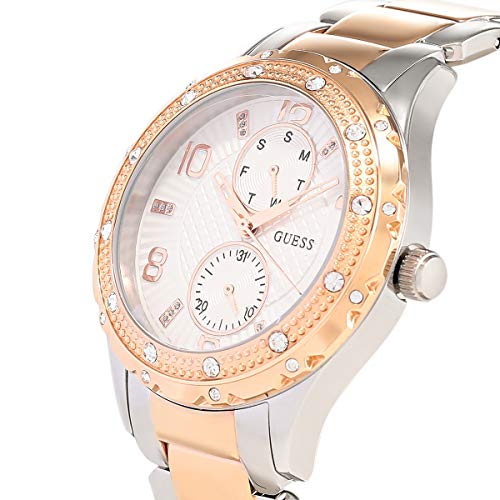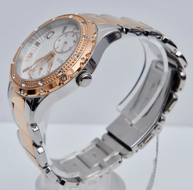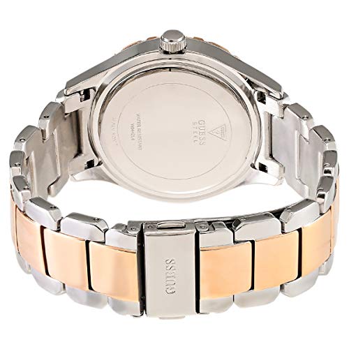 Guess Guess W0442L4 is a real treat for watch enthusiasts. The unusual design and subtle beauty ensure that the watch perfectly matches any style. The heart of the watch is a precise quartz movement. The watch is equipped with a solid case made of stainless steel. The bracelet made of high-quality stainless steel perfectly complements the watch's design.Guess women watches have always been a rage due to their superb, long lasting performance and creative, stylish design. The Guess W0442L4 for Women features a 39mm, round case made of stainless steel that offers incredible durability. The case is held by a 20mm broad bracelet in rose gold and silver, which is also composed of stainless steel for added sturdiness. This elegant looking watch is sure to fetch you a lot of praises from anyone who lays eyes on this timepiece. Featuring a fold over clasp with a double push button release, this watch fits firmly, yet comfortably on your hands. The watch is extremely reliable as it operates on the Japanese quartz movement that provides correct timekeeping