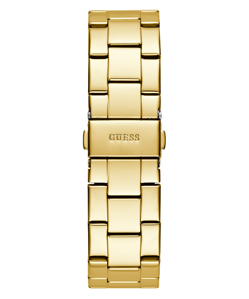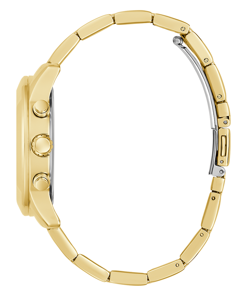 Sophisticated with a hint of glamour, this gold-tone wrist watch from Guess is the ultimate everyday accessory. Complete with a high-contrast dial, three inset subdials and a sparkling stone embellished bezel, it layers perfectly with your everyday wear!