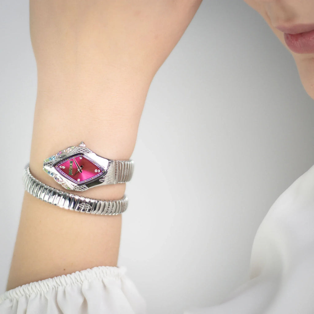 Elevate your wrist game with the Just Cavalli Ferocious Pink Dial Silver Steel Strap Watch, where bold style meets timeless elegance. This striking timepiece features a captivating pink dial that commands attention while the polished silver steel strap adds a touch of sophistication. Perfect for women who refuse to blend in, this watch seamlessly transitions from everyday wear to special occasions. The precision movement ensures reliable timekeeping, while the quality construction promises durability that lasts. Make a statement with a watch that's as fearless and fabulous as you are.