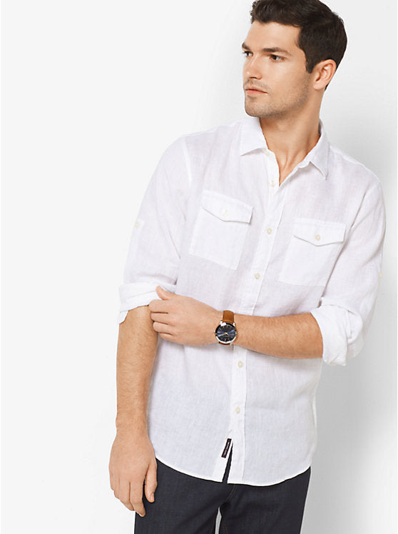 Marked by a minimalist sensibility, our Slim Runway watch is in a class all its own. The oversized bezel and blue dial read sleek, while the leather strap ensures a comfortable fit. Wear it to add poise and polish to everyday looks.Stainless steel case with a brown (calfskin) leather strap. Fixed stainless steel bezel. Blue dial with silver-tone hands and index hour markers. Dial Type: Analog. Quartz movement. Scratch resistant mineral crystal. Pull / push crown. Solid case back. Case size: 44 mm. Case thickness: 9 mm. Round case shape. Band width: 22 mm. Tang clasp. Water resistant at 50 meters / 165 feet. Casual watch style. Michael Kors Slim Runway Blue Dial Men's Watch MK8508.