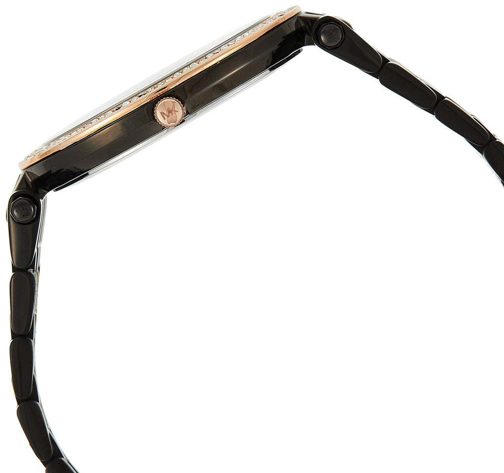 Michael Kors MK3407 Ladies Darci Watch is made from PVD rose plating and is powered by a quartz movement. It is fastened with a black metal bracelet and has a black dial.