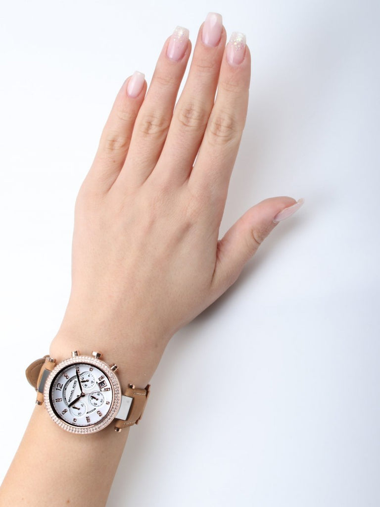 Stainless steel case with a tan leather strap. Fixed rose gold-tone bezel set with crystals. White dial with luminous rose gold-tone hands and crystal index hour markers. Arabic numeral marks the 12 o'clock position. Minute markers around the outer rim. Dial Type: Analog. Luminescent hands. Date display between 4 and 5 o'clock positions. Chronograph - three sub-dials displaying: 60 second, 30 minute and 24 hour. Quartz movement. Scratch resistant mineral crystal. Pull / push crown. Solid case back. Case diameter: 39 mm. Case thickness: 11.5 mm. Round case shape. Band width: 20 mm. Tang clasp. Water resistant at 100 meters / 330 feet. Functions: chronograph, date, hour, minute, second. Casual watch style. Michael Kors Parker Chronograph Tan Leather Ladies Watch MK5633.