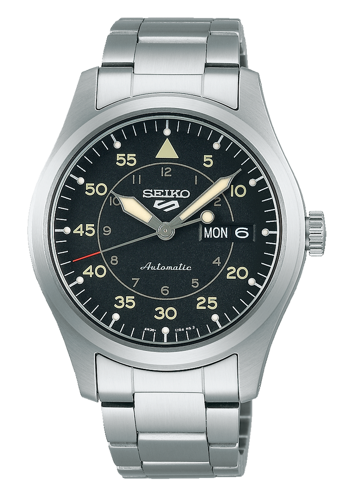 The Seiko 5 Sports Flieger SRPH27K1 combines aviation-inspired design with reliable automatic movement. Featuring a striking black dial, bold hour markers, and a date window, this timepiece delivers classic pilot watch aesthetics. The stainless steel case and matching bracelet offer durability and everyday versatility, while the automatic caliber ensures consistent timekeeping. Water-resistant to 100m, it's built for both casual wear and adventure. A true Seiko 5 with the heritage and precision you expect.