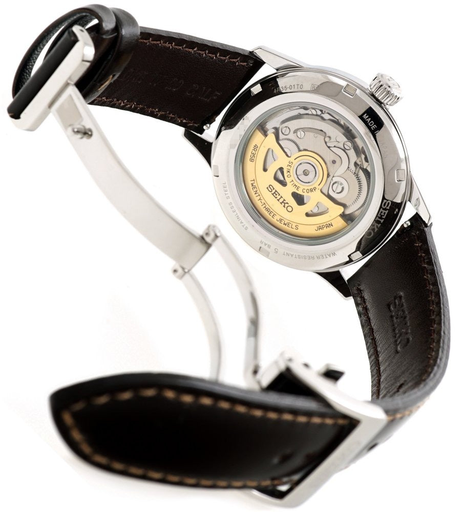 The models in the PRESAGE Cocktail collection are easily recognizable by their sunburst dial with a sunray effect. Their elegant aesthetic simplicity is in perfect harmony with Japanese tradition. The green of the dial of this model is inspired by the color of the "Mockingbird" cocktail, made with tequila, mint liqueur and lime. Paired with a dark brown leather strap for an elegant yet comfortable style, this automatic watch is simply perfect for any occasion.