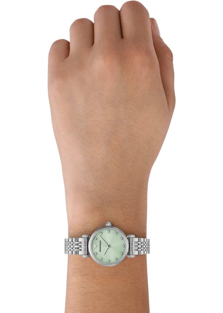 The Emporio Armani AR11667 ladies watch features a sophisticated green dial complemented by two-hand movement, offering clear and precise timekeeping. Its sleek design merges elegance with functionality, making it an ideal accessory for a refined, everyday look.
