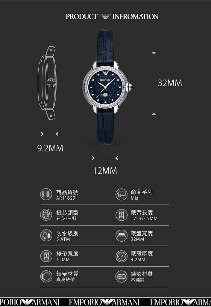Elevate your everyday elegance with the Emporio Armani Mia Moonphase, a sophisticated timepiece designed for the modern woman. This stunning watch features a captivating blue dial complemented by a luxurious blue leather strap, creating a seamless blend of style and refinement. The moonphase complication adds an enchanting celestial touch, making it more than just a watch—it's a conversation starter. Crafted with Emporio Armani's signature attention to detail, this AR11629 model delivers timeless beauty that transitions effortlessly from office to evening. Invest in a watch that celebrates your refined taste and complements any wardrobe with understated luxury.