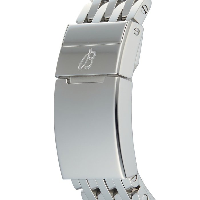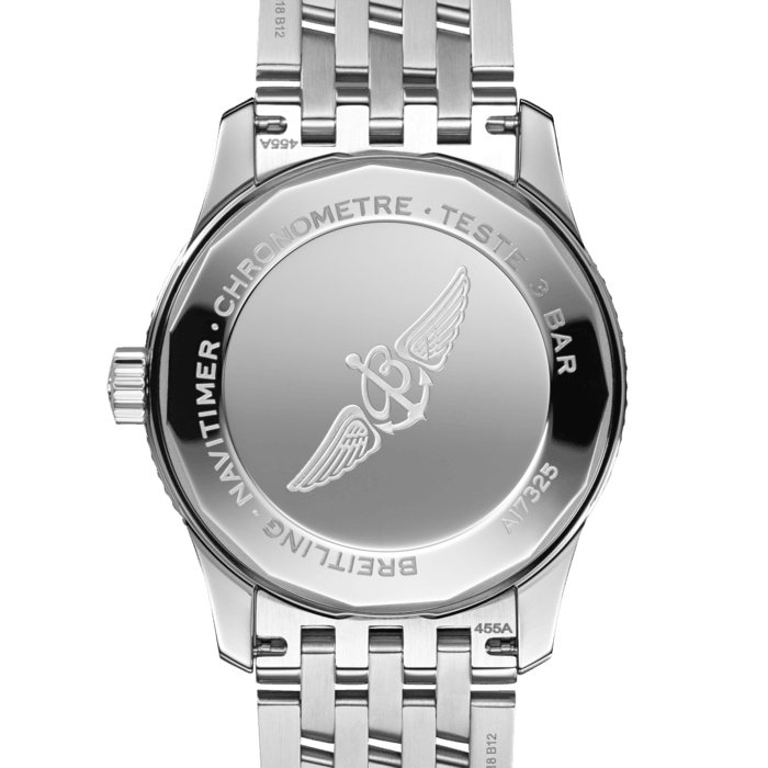 Stainless steel case with a stainless steel bracelet. Bi-directional rotating stainless steel bezel. Black dial with luminous silver-tone hands and index hour markers. Minute markers. Tachymeter scale around the outer rim. Dial Type: Analog. Luminescent hands and markers. Date display at the 6 o'clock position. Breitling calibre 17 automatic movement, based upon ETA 2824-2, containing 25 Jewels, bitting at 28800 vph, and has a power reserve of approximately 42 hours. Scratch resistant sapphire crystal. Pull / push crown. Solid case back. Round case shape. Case size: 38 mm. Case thickness: 10.10 mm. Band width: 20 mm. Deployment clasp. Water resistant at 30 meters / 100 feet. Functions: date, hour, minute, second, chronometer. Navitimer Series. Luxury watch style. Watch label: Swiss Made. Breitling Navitimer 38 mm Automatic Chronometer Black Dial Men's Watch A17325241B1A1.