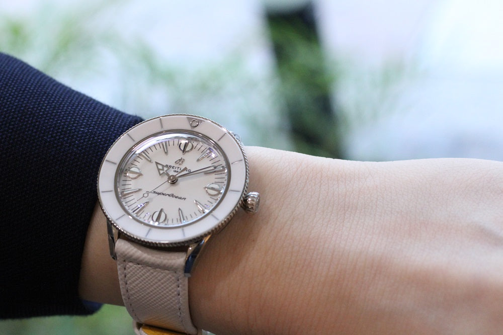 The Breitling Superocean Heritage '57 Pastel Paradise combines vintage charm with modern elegance, featuring a pristine white dial paired with a white leather strap. Designed for women, this timepiece offers precise Swiss automatic movement and water resistance suitable for everyday wear and aquatic adventures. Its sleek, minimalist design and durable construction make it a refined choice for those seeking both style and performance in a luxury watch.