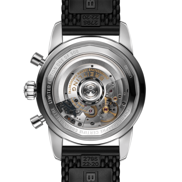 Available here in DLC-coated stainless steel, this Superocean Heritage B01 Chronograph 44 features a black-eye green dial. Offered with a “mesh-styled” black rubber strap fitting a folding buckle, this Superocean Heritage is powered by the in-house Breitling Manufacture Caliber 01, a COSC-certified chronometer.