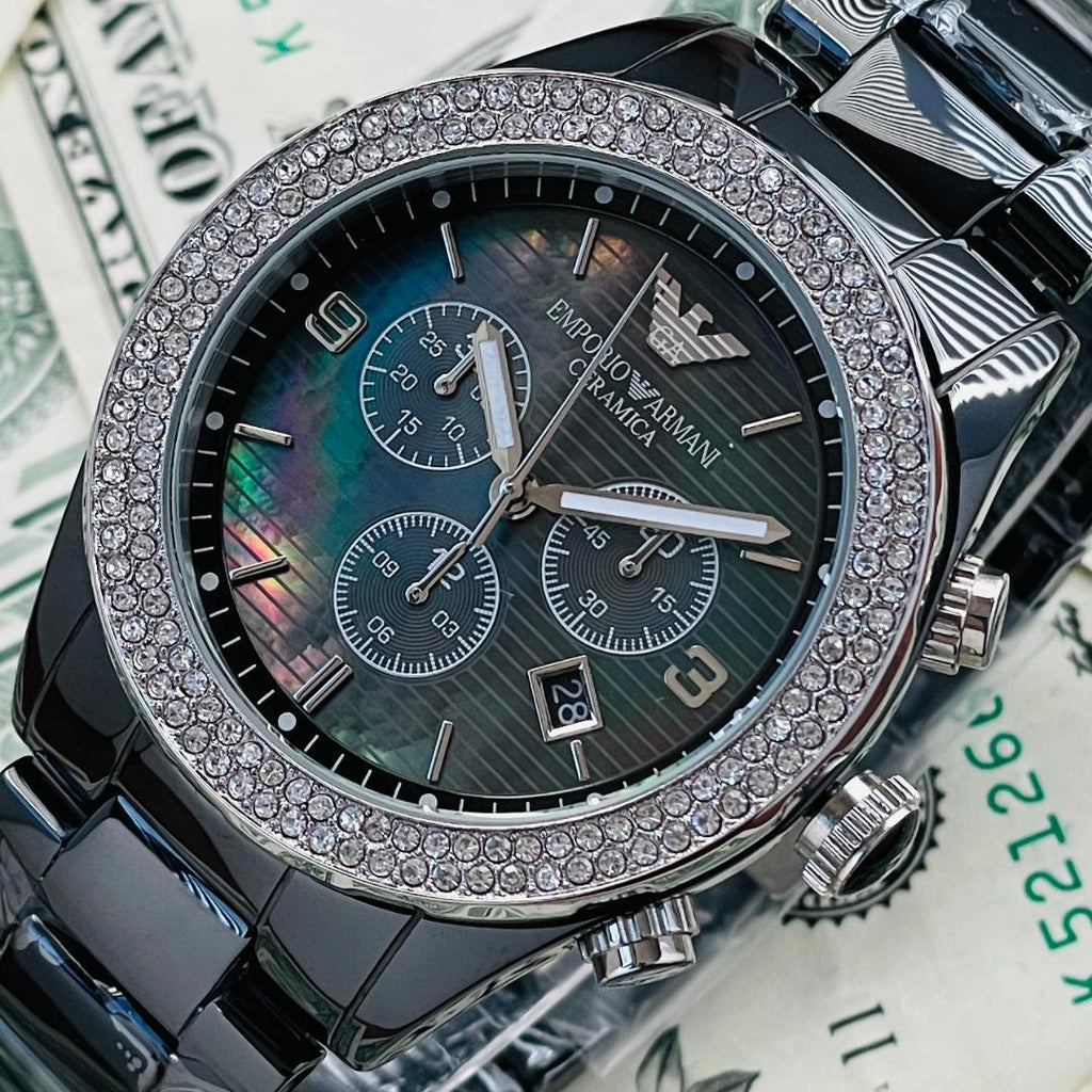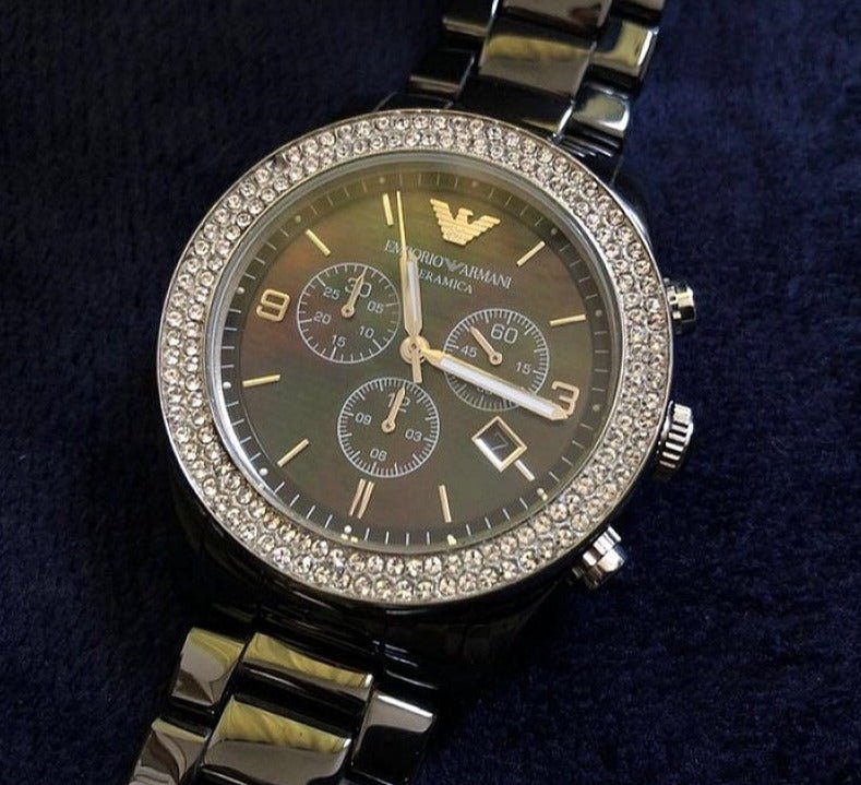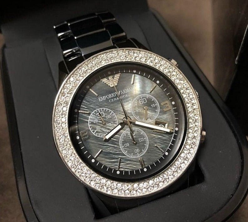 This ladies' black mother of pearl dial chronograph watch is a stunning timepiece from the Emporio Armani Ceramica Collection, featuring a crystal encrusted bezel and subtle silver markers.