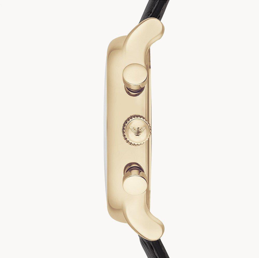 This Emporio Armani Luigi Chronograph Black Dial Men's Watch AR1917 comes in gold-tone stainless steel case with a black leather strap. Fixed gold-tone bezel. Black dial with luminous gold-tone hands and index hour markers. Minute markers around the outer rim. The Emporio Armani logo marks the 12 o'clock position. Dial Type: Analog. Date display between the 4 and 5 o'clock positions.