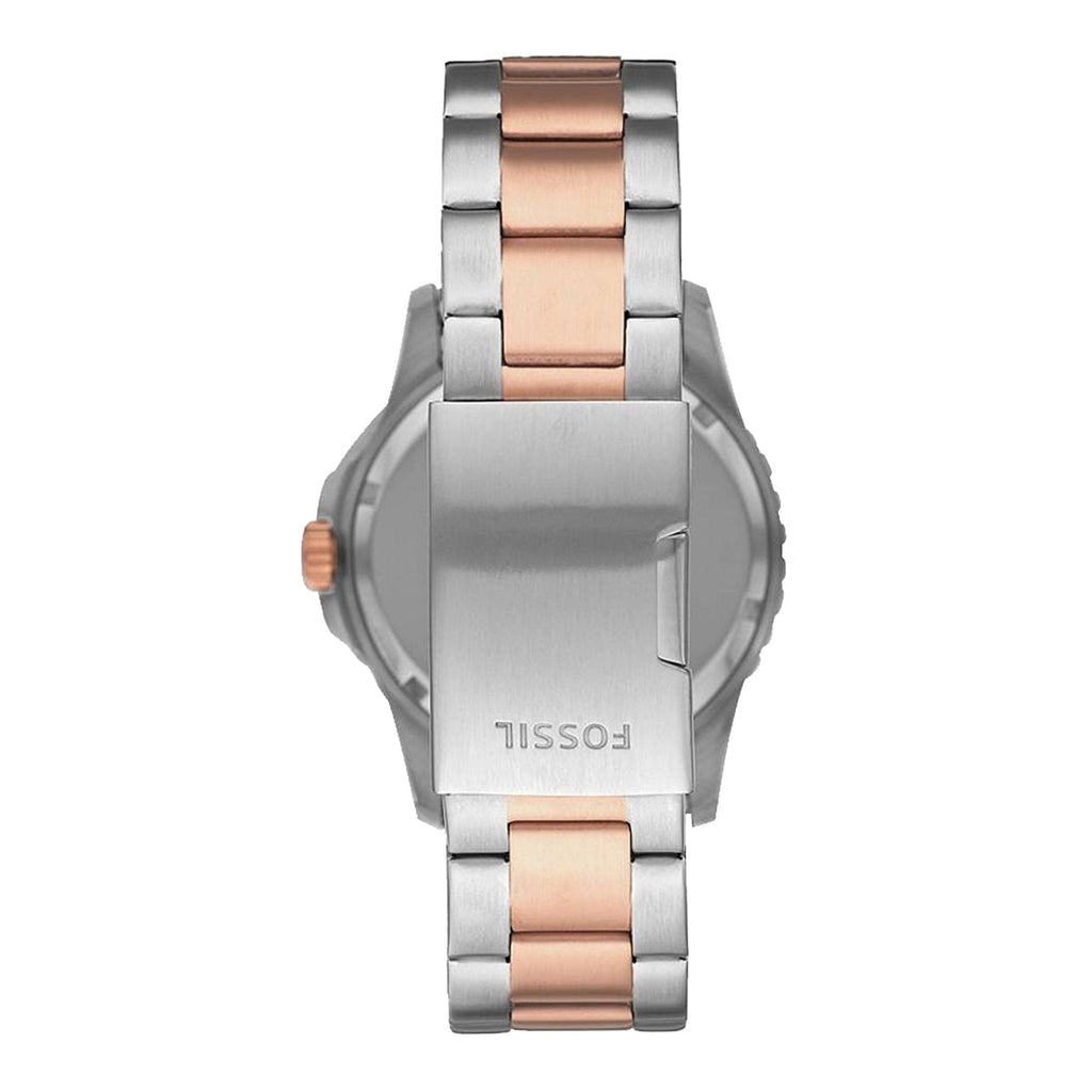 This Fossil Grant Chronograph Blue Dial Two-tone Men's Watch FS5024 comes in stainless steel case with a two-tone (silver and rose gold-tone) stainless steel bracelet. Fixed rose gold-tone bezel. Blue dial with luminous rose gold-tone hands and Roman numeral hour markers. Minute markers around the outer rim. Dial Type: Analog. Luminescent hands and markers.