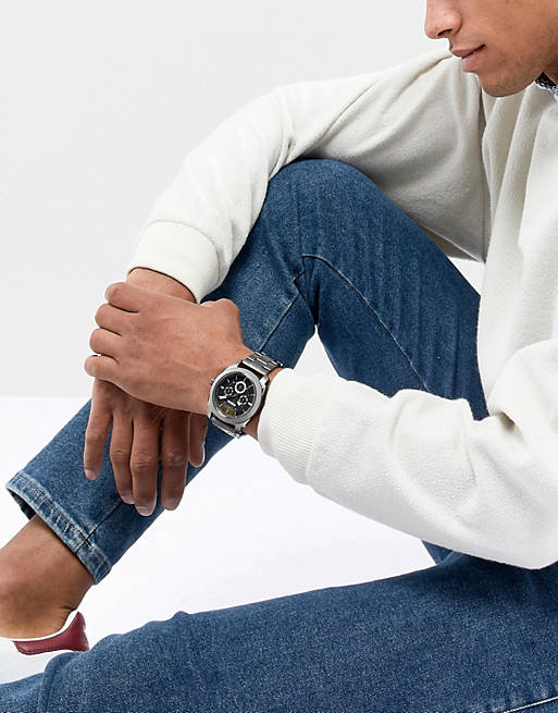 This Fossil Machine Chronograph Black Dial Men's Watch FS4662 comes in smoke ion-plated stainless steel case and bracelet. Fixed smoke ion-plated bezel. Black dial with silver-tone hands and index hour markers. Minute markers around the outer rim. Dial Type: Analog. Luminescent hands and markers. Date display between the 4 and 5 o'clock positions.