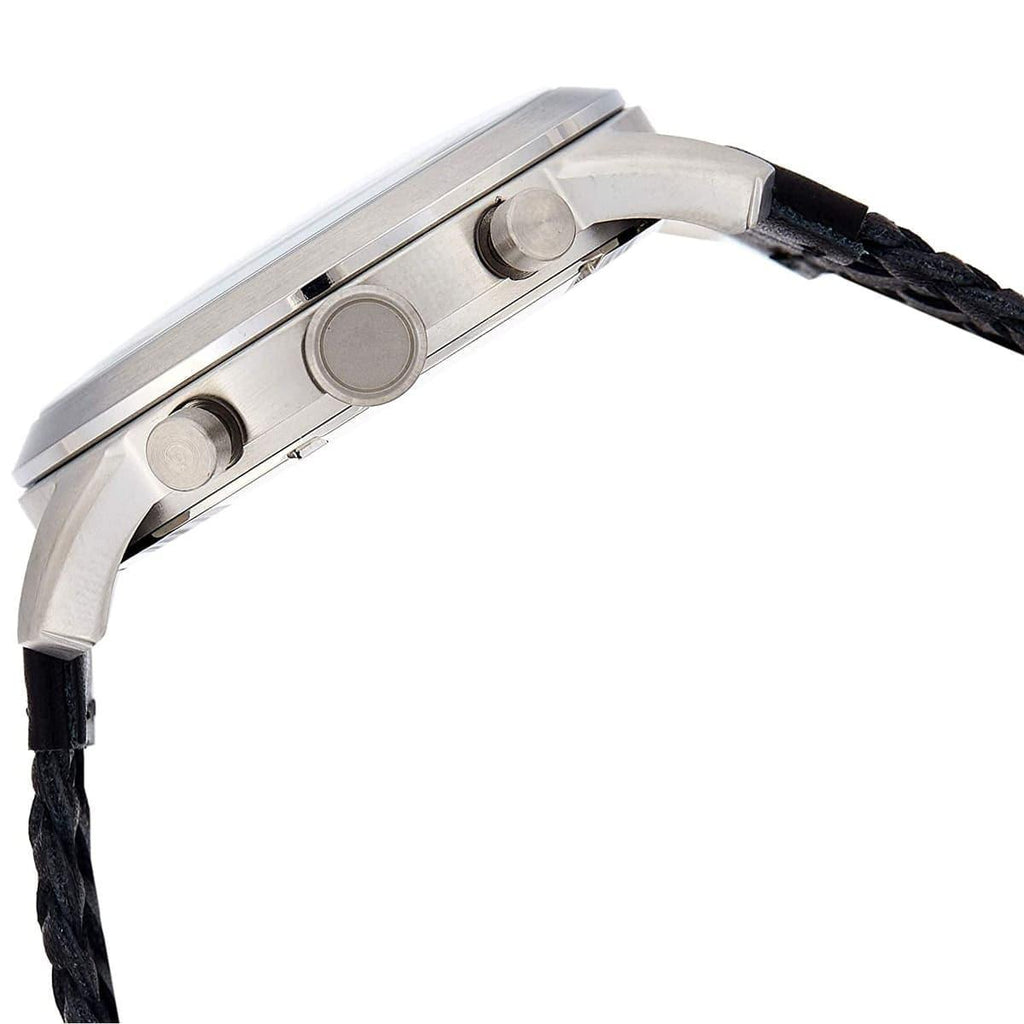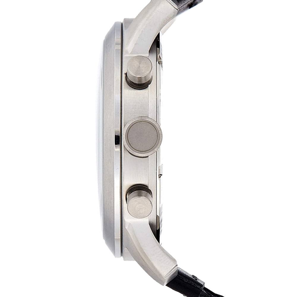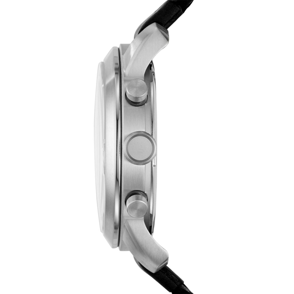 This Fossil Pilot 54 Chronograph Black Dial Men's Watch FS5181 comes in stainless steel case with a black leather strap. Fixed bezel. Black dial with silver-tone hands and Arabic numeral hour markers. Minute markers around the outer rim. Dial Type: Analog. Date display between 4 and 5 o'clock position. Chronograph - sub-dials displaying: three- 60 seconds, 60 minutes, and 24 hours. Quartz movement. Pull / push crown. Solid case back. Case size: 44 mm. Case thickness: 12 mm. Round case shape. Band width: 22 mm. Buckle clasp. Water resistant at 50 meters / 165 feet. Functions: chronograph, date, hour, minute, second. Casual watch style.
