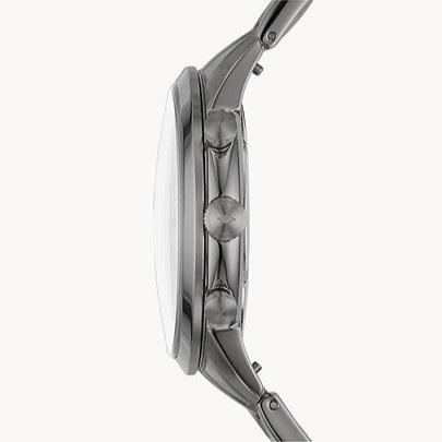 Quartz movement. Scratch resistant mineral crystal. Pull / push crown. Solid case back. Round case shape, case size: 44 mm, case thickness: 12 mm. Band width: 22 mm. Deployment clasp with a push button release. Water resistant at 50 meters / 165 feet. Functions: chronograph, hour, minute, second. Sport watch style. Fossil Townsman Chronograph Black Dial Men's Watch FS5349.