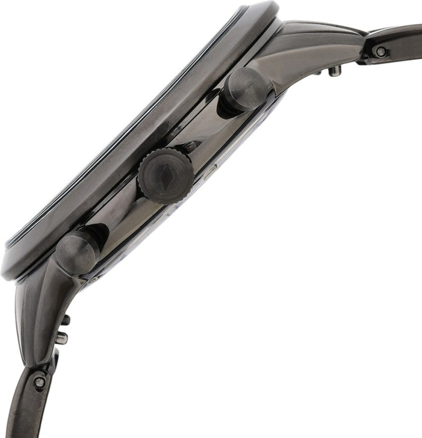 Grey stainless steel case and bracelet. Fixed grey stainless steel bezel. Black dial with luminous silver-tone hands and index hour markers. Minute markers around the outer rim. Dial Type: Analog. Luminescent hands and markers. Chronograph - two sub-dials displaying: 60 second, 60 minute.