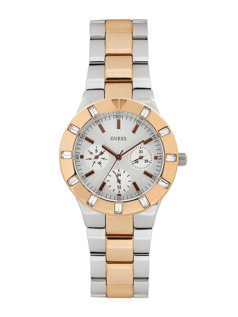 Classy and sassy, the Guess glisten ladies watch W14551L1 is an elegant timepiece with a two tone steel case and silver coloured dial. This highly practical and functional, self-adjustable watch features a day, date and 24-hour sub-dial. The crystal stones on the case add more to its beauty. The two-tone adjustable bracelet of this 50 metres water-resistant watch can be secured tightly with the deployment clasp.
