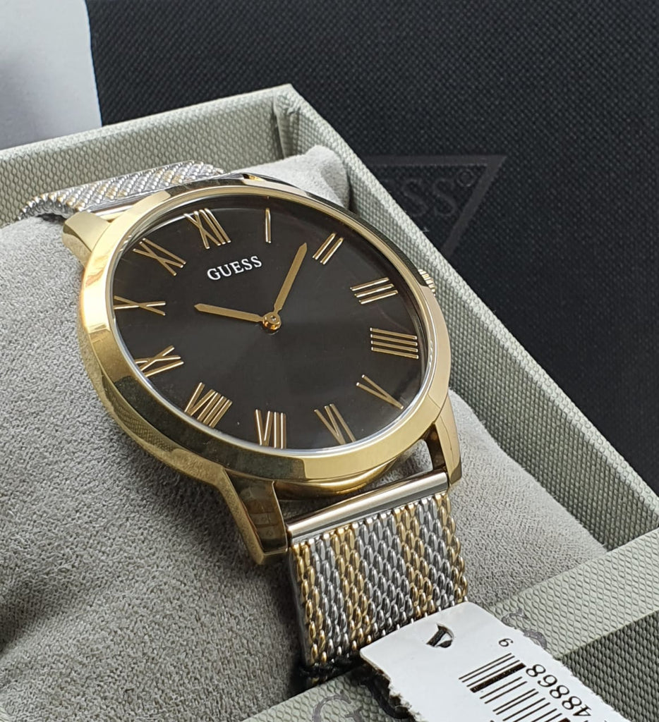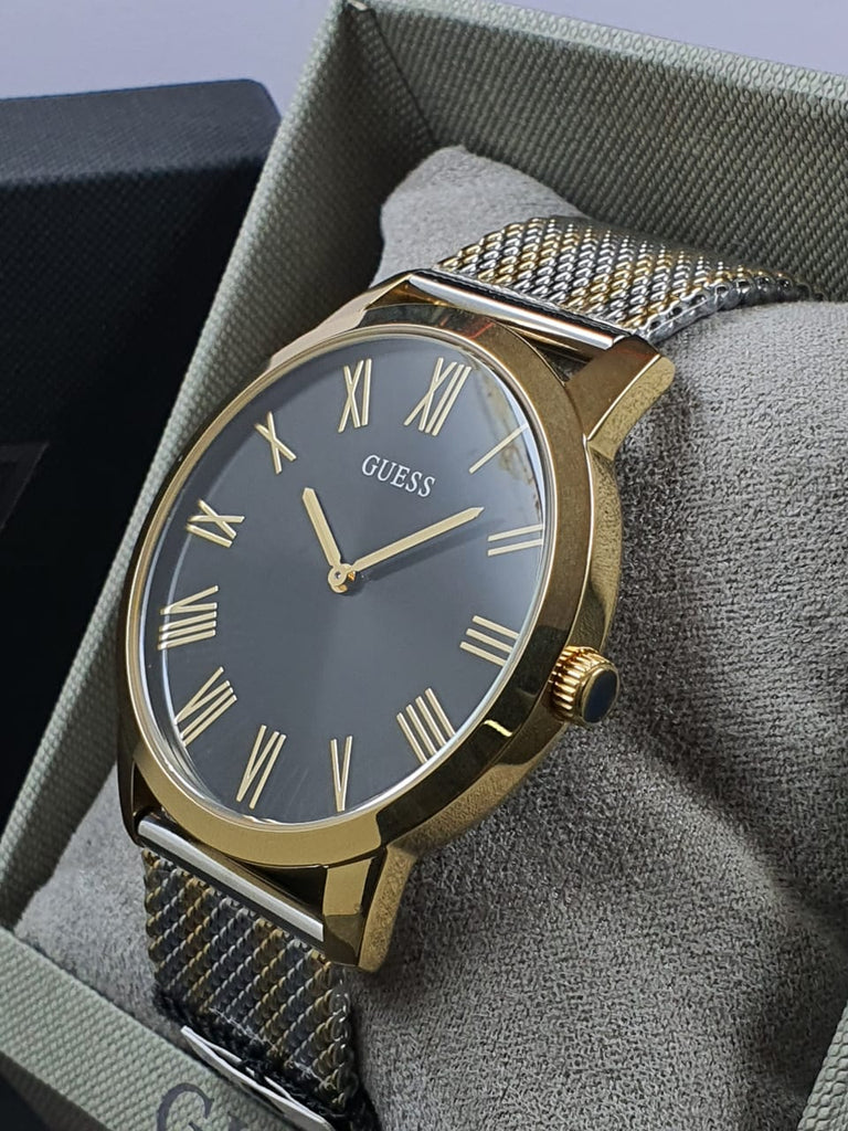 GUESS Gents watch with polished gold case, sunray black dial with gold highlights and polished gold mesh bracelet with silver stripes.