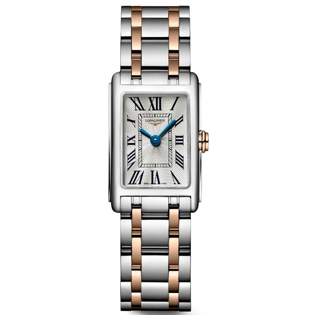 Longines DolceVita 17.7 x 27 mm watch. Model reference: L5.258.5.71.7. Stainless steel case with 18 karat pink gold crown. Silver dial. Quartz movement. Stainless steel and 18 karat pink gold bracelet with triple safety folding clasp and push-piece opening mechanism.