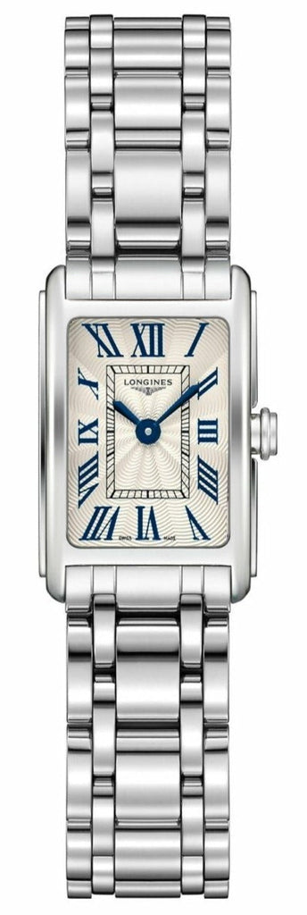 Longines DolceVita 17.7 x 27 mm watch. Model reference: L5.258.4.71.6. Stainless steel case. Silver dial. Quartz movement. Stainless steel bracelet with triple safety folding clasp and push-piece opening mechanism. This Longines watch comes in original packaging with a set of documents
