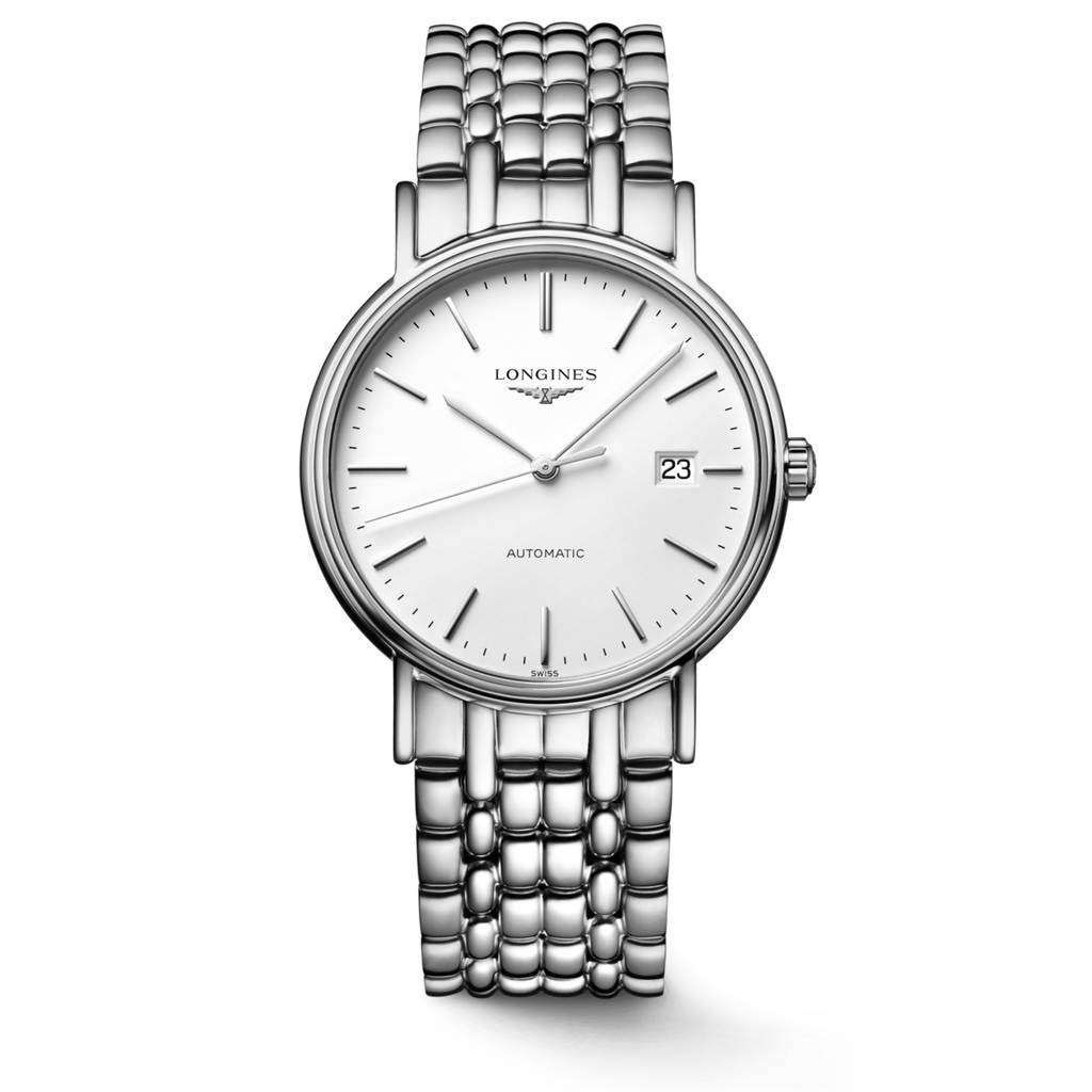 Longines Presence 38.5 mm watch. Model reference: L4.921.4.12.6. Steel case. White dial. Automatic movement. Steel bracelet. This Longines watch comes in original packaging with set of documents and 2 years warranty