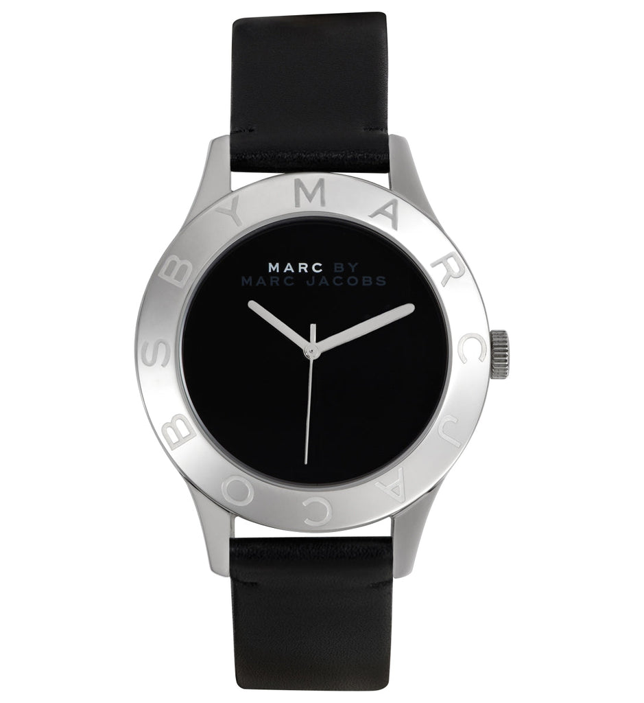 Stainless steel case with a black leather strap. Fixed stainless steel bezel. Black dial with silver-tone hands. No markers. Dial Type: Analog. Quartz movement. Scratch resistant mineral crystal. Pull / push crown. Solid case back. Case diameter: 40 mm. Case thickness: 9 mm. Round case shape. Band width: 18 mm. Tang clasp. Water resistant at 30 meters / 100 feet. Functions: hour, minute, second. Casual watch style. Marc by Marc Jacobs Blade Black Dial Black Leather Unisex Watch.