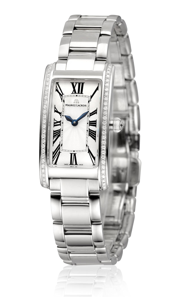 Stainless steel case with a stainless steel bracelet. Fixed stainless steel bezel set with diamonds. Silver dial with blue hands and Roman numeral hour markers. Minute markers around an inner ring. Dial Type: Analog. Quartz movement. Scratch resistant sapphire crystal. Solid case back. Case dimensions: 39 mm x 20.9 mm. Case thickness: 8 mm. Square case shape. Band width: 15 mm. Double fold over clasp. Water resistant at 30 meters / 100 feet. Functions: hour, minute. Dress watch style. Watch label: Swiss Made. Item Variations: FA2164 SD532 118, FA2164.SD532.118, FA2164SD532118. Maurice Lacroix Fiaba Silver Dial Ladies Watch FA2164-SD532-118.