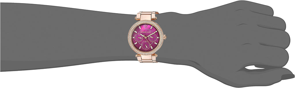 Rose gold-tone stainless steel case and bracelet. Fixed rose gold-tone bezel set with crystals. Plum mother of pearl dial with luminous rose gold-tone hands and crystal-set index hour markers. An Arabic numeral appears at the 12 o'clock position. Minute markers around the outer rim. Dial Type: Analog. Luminescent hands. Three multi-function sub-dials displaying: date, day of the week and 24 hours. Quartz movement. Scratch resistant mineral crystal.Michael Kors Mini Parker watch has a plum colored mother of pearl dial that gives it an appealing look. Get this Michael Kors analog watch at souq.com.All you need for the best dress session is the Michael Kors MK6403 Mini Parker Watch. It adds a touch of sophistication and sass to your overall appearance. This Michael Kors analog watch looks as beautiful as a woman’s tender heart yet is as strong as her willpower. The case and bracelet is made using durable and sturdy stainless steel, painted in a rose-gold shade.