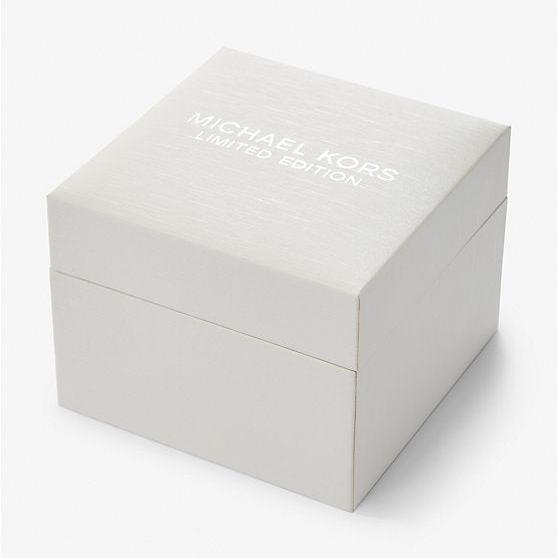 A three-hand quartz movement and Roman numeral time stops add a classic finish. Its slender casebody reverses to reveal Michael’s signature and a unique identification number, while the sleek box will keep it free from dust and scratches.