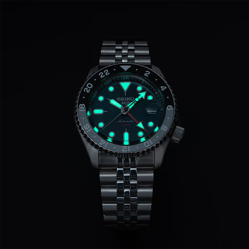 Powered by Seiko’s reliable Calibre 4R34 movement with a 41-hour power reserve, it features a 24-hour rotating bezel and GMT hand for tracking a second time zone — ideal for travel and everyday wear.