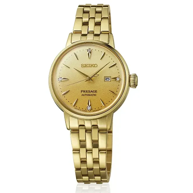 Seiko Presage Cocktail Time Automatic Diamonds Gold Dial Gold Steel Strap Watch for Women - SRE018J1
