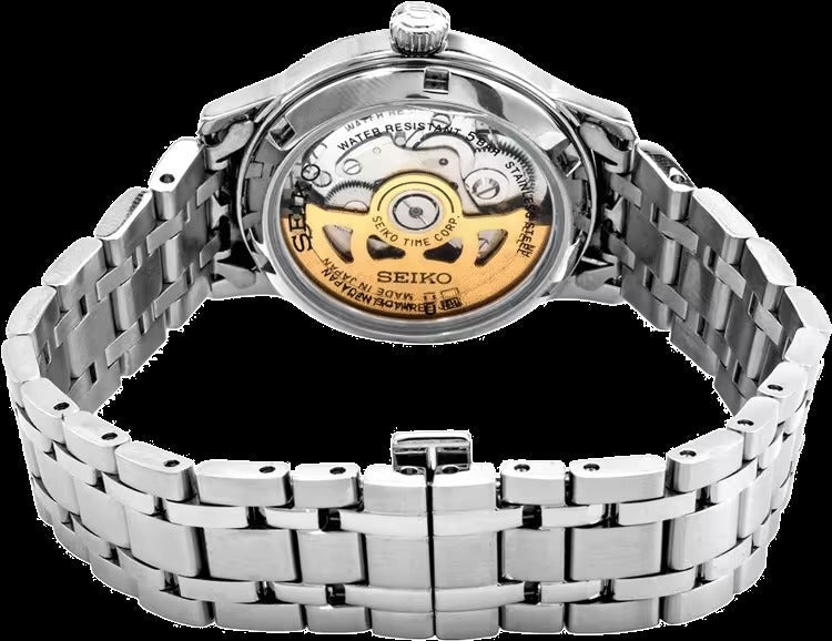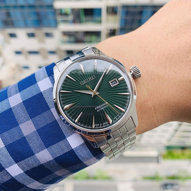 The Seiko Presage Cocktail Time SRPE15J1 combines timeless elegance with reliable automatic movement. Featuring a striking green dial that captures light beautifully, this watch brings sophistication to any occasion. The stainless steel bracelet offers durability and a polished finish that complements both casual and formal wear. With a 40.5mm case size and water resistance to 100 meters, it's built for everyday wear while maintaining the refined aesthetic of a dress watch. The automatic movement ensures precision timekeeping without batteries. A versatile timepiece that transitions seamlessly from the office to evening events.