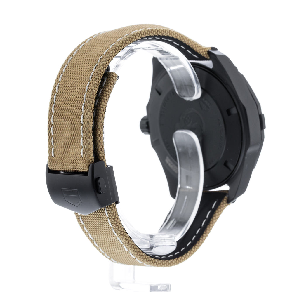 titanium case, with a black dial. Beige synthetic Strap. automatic movement. sapphire crystal. 43mmx 43mmx 9mm case. 22mm band width. 300 meters water resistant. Tag Heuer Aquaracer Automatic Beige Synthetic Watch WAY208C.FC6383