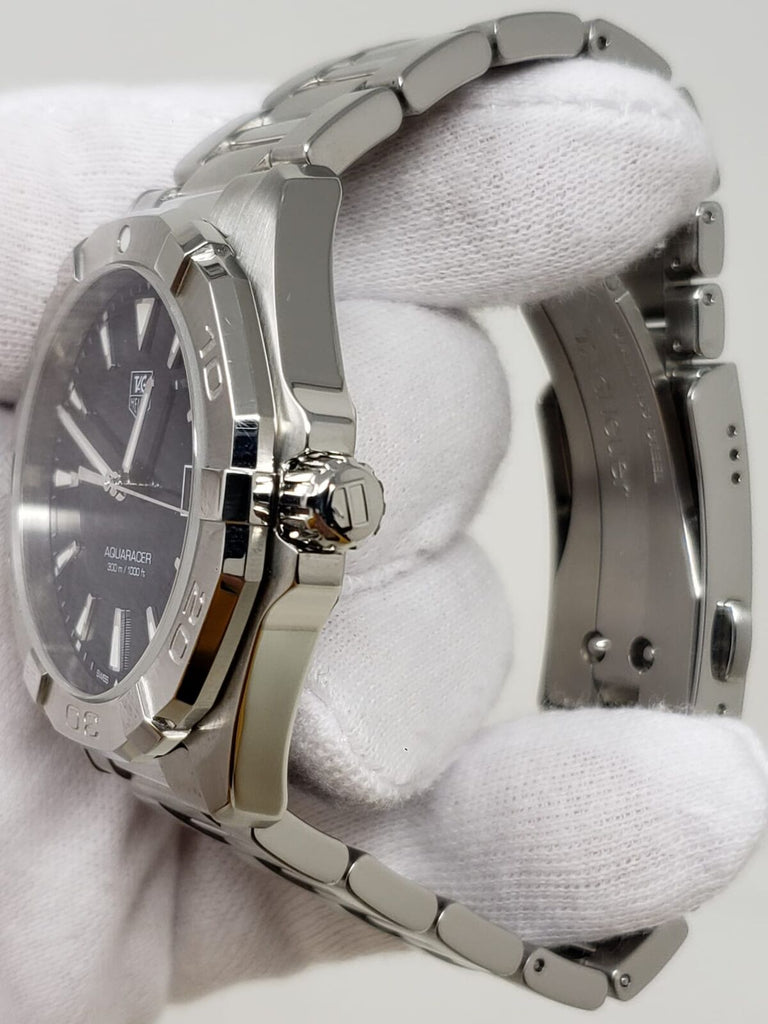 Swiss-made, this bold TAG Heuer Aquaracer is an aesthetic 41 mm watch. This model features a Steel case and a Quartz movement.stainless steel case, with a blue dial. Silver stainless steel Bracelet. quartz movement. sapphire crystal. 40mmx 40mmx 12mm case. 20mm band width. 300 meters water resistant. Tag Heuer Aquaracer Quartz Stainless Steel Watch WAY1112.BA0928