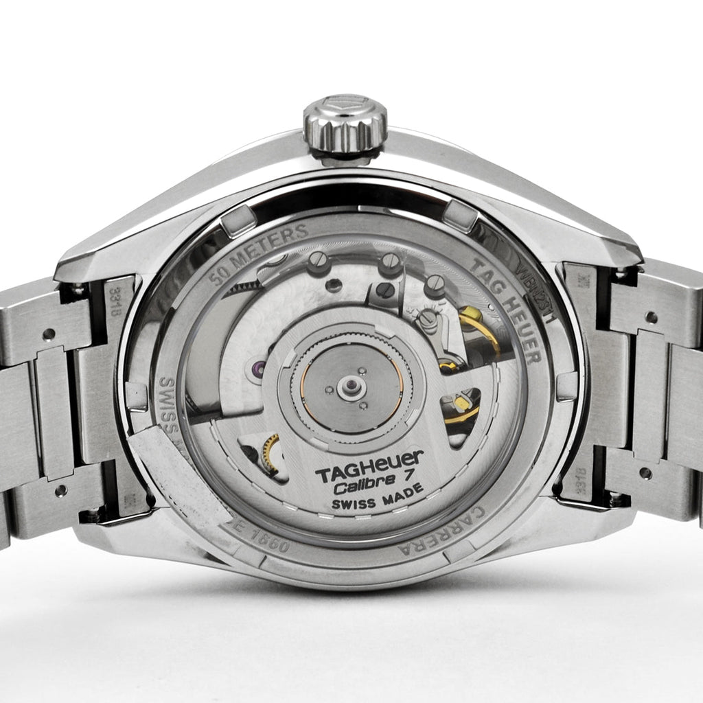 The thin 36mm steel case houses the TAG Heuer Calibre 7 Automatic movement, with a 56-hour power reserve. Water-resistant to 50 metres.