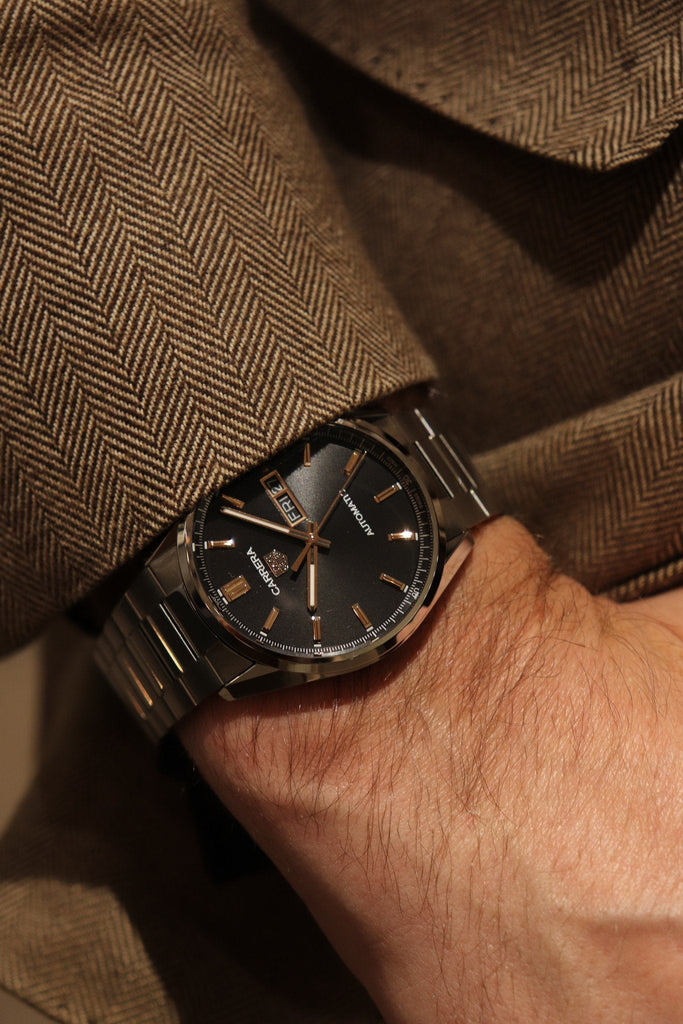 The iconic lines of the TAG Heuer Carrera's long lugs and round case stand out from across a room. A strong statement of elegance.